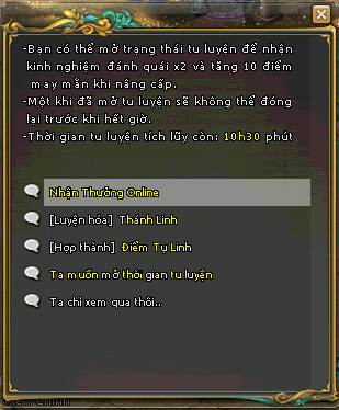 • Hàng ngày người chơi có thể nhận thêm nhiều phần thưởng tại Tu Luyện Châu khi Online đạt đủ điều kiện bên dưới.